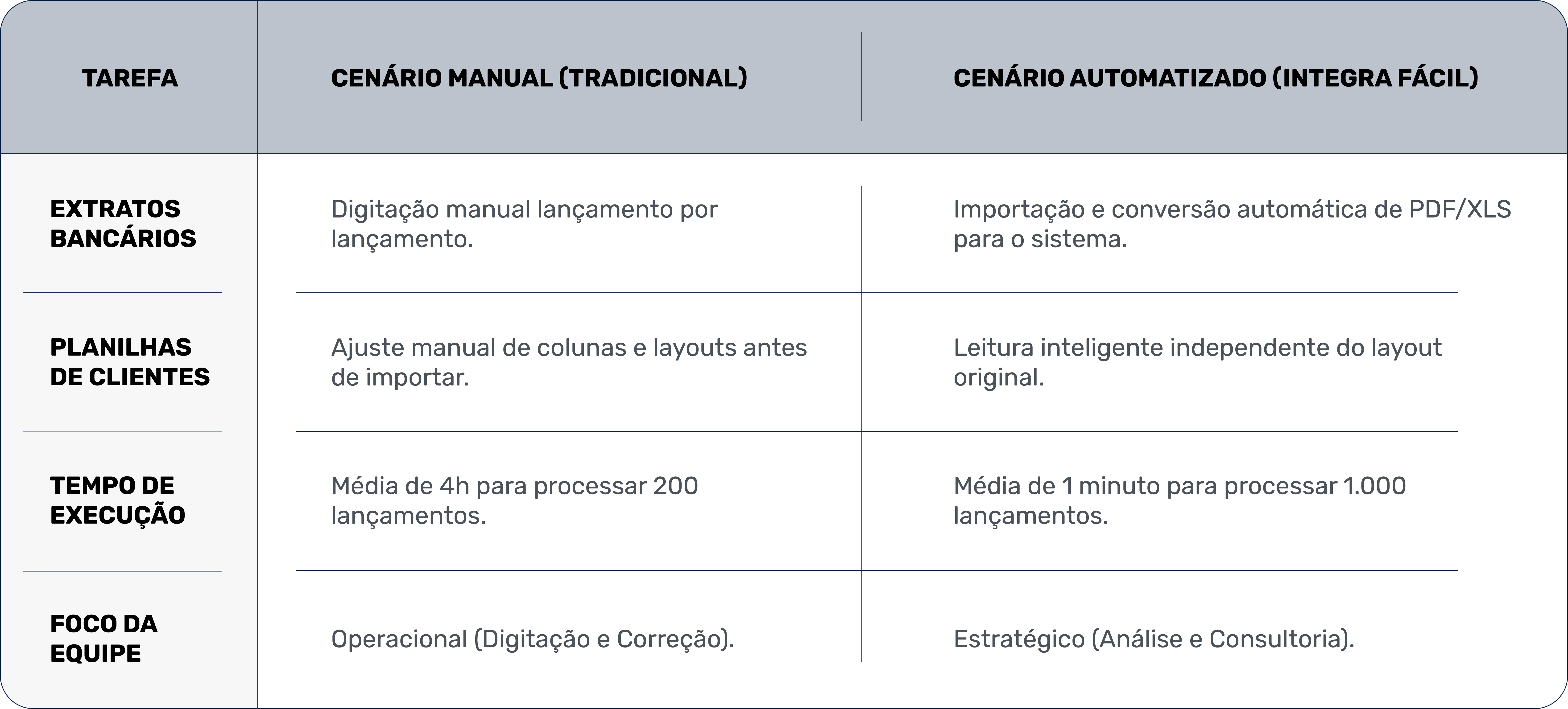 A automação elimina etapas manuais do processo, como digitação de lançamentos e ajuste de layouts, transformando relatórios em dados contábeis rapidamente e sem erros, o que faz com que o trabalho seja feito em menos tempo e dentro do expediente normal.